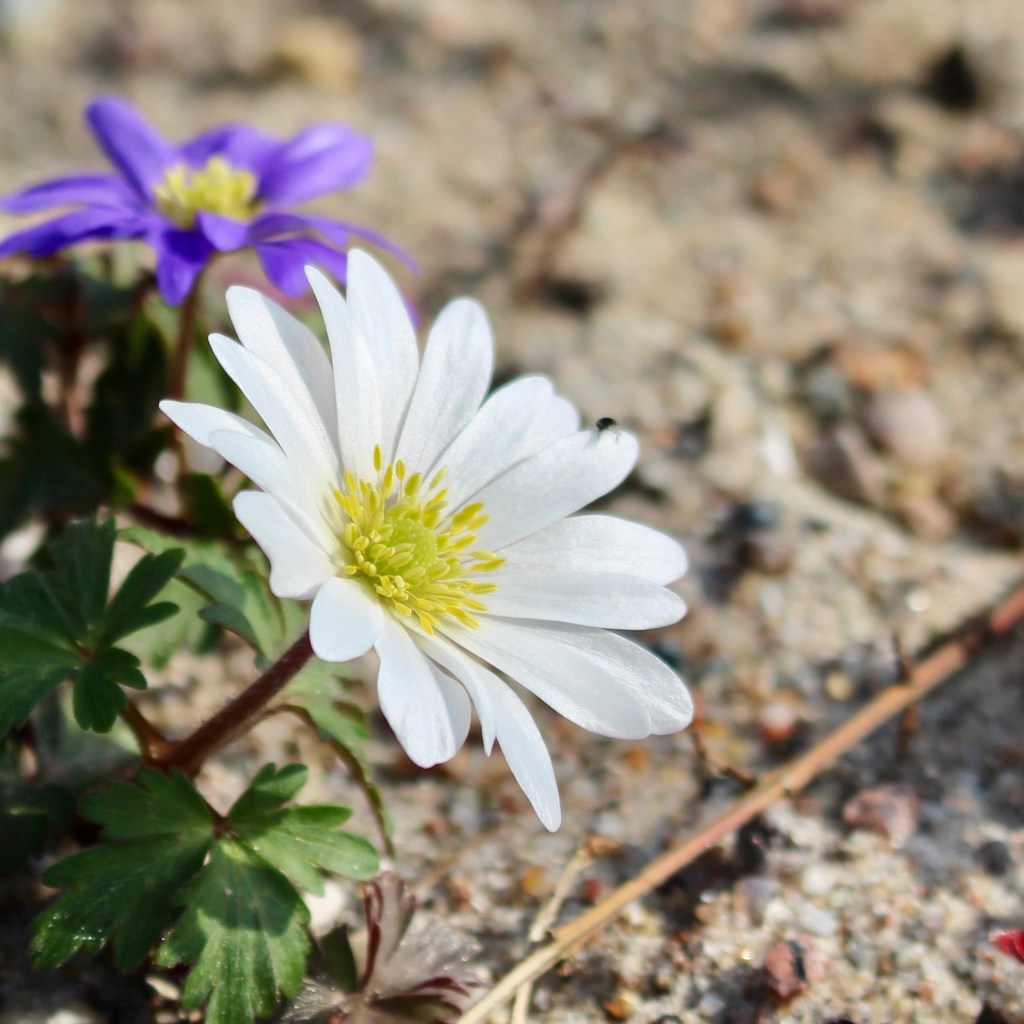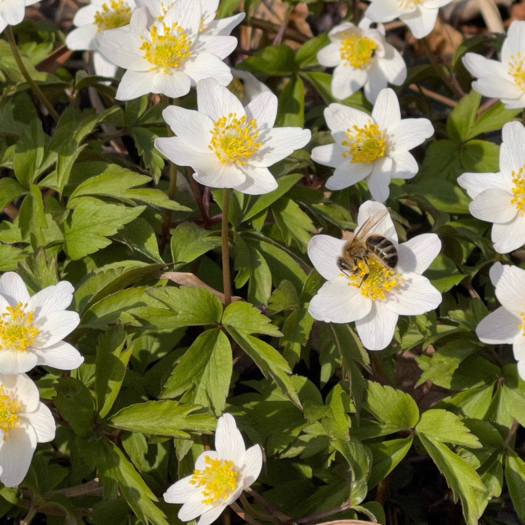 Auch die Strahlenanemone (Anemone blanda) in verschiedenen Farben wie Weiß, Blau, Violett, Rosa liefert in den Monaten März-Mai Nahrung und bildet mit den Jahren Ausläufer und dichte Bestände im Gehölzschatten.