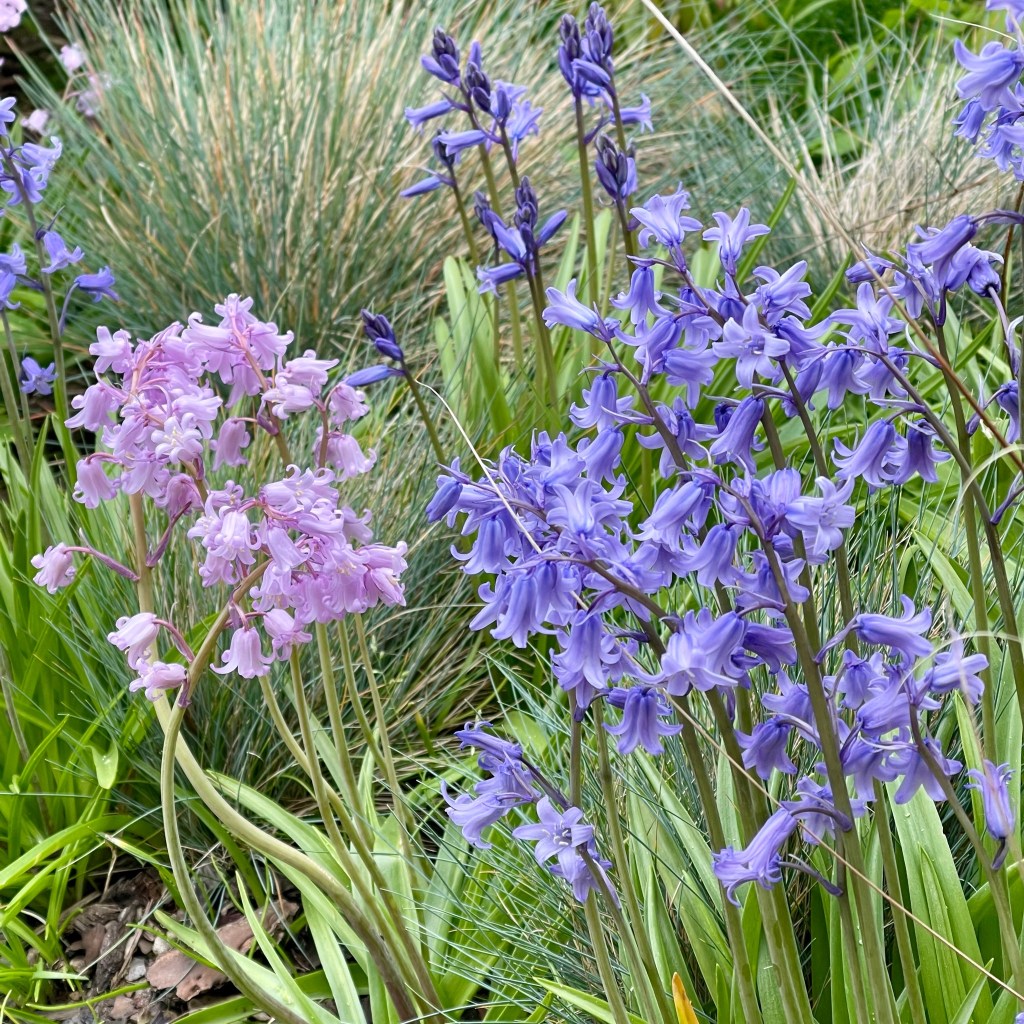 Ja und dann sind da noch die in Nordfriesland häufig zu findenen Hasenglöckchen (Hyacinthoides hispanica), die ihren großen Auftritt im Mai haben. Sie können sich an ihnen zusagenden schattigen Standorten extrem versamen, aber ich finde sie dennoch nicht lästig, sondern freue mich jedes Jahr über die blaue Masse in meinen Gräser-betonten Beeten.