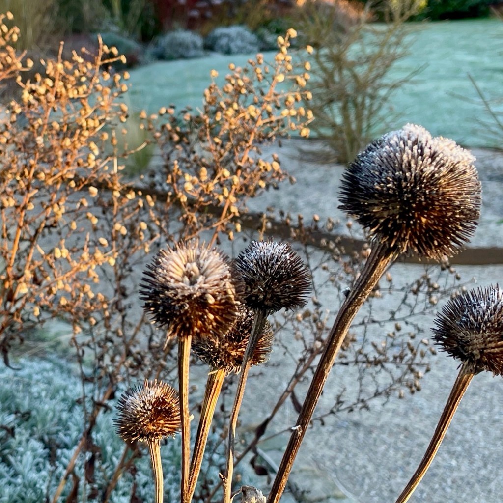 Die einfachsten Gestaltungen sind oft die schönsten. Bremst Euch als Gartenbesitzer im Aufräumen vorm Winter! Es tut Eurem Rücken gut und bietet sowohl Nist-, Schutz- und Überwinterungsplätze für Insekten, die im Winter bei uns bleiben (z. B. das Tagpfauenauge) oder ihre Nachkommen winterfest unterbringen müssen. Vögel finden in den trockenen Samenständen Futter. Schaut Euch das Foto an – wie schön sind Schnee- oder Rauhreif-bedeckte Samenstände von Echinacea und Astern!