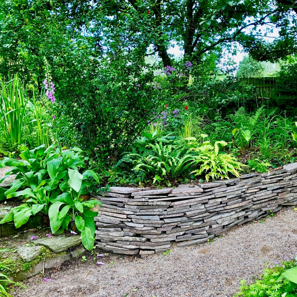 In Nordfriesland kennen wir alle die wunderschönen Friesenwälle. Leider sind einige mit in Beton gebundenen Findlingssteinen gebaut. Wertvoll (und übrigens auch viel schöner) sind hingegen die „echten“ Trockenmauern. Hier werden Natursteine ohne Mörtel aufeinandergesetzt, oft angelehnt an ein Erdreich dahinter, bepflanzt oder als Wegbegrenzung wie im Foto. Dieser unglaublich wertvolle Lebensraum bietet Eidechsen und Insekten Nist- und Schutzräume. Außerdem sind die Mauern mit unterschiedlichen Steinmaterialien strukturgebende wunderschöne Gartenelemente. Sie schützen andere Gartenteile vor den nordischen Winden, geben Wärme ab und verhindern Erosion.
