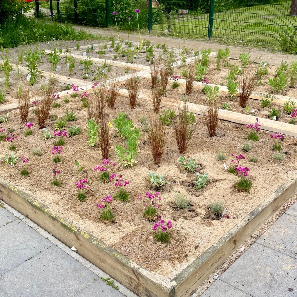 Warum ist ein Sand-/Kiesbeet denn nun ein „besserer“ Garten für unsere kleinen Gartenbewohner? Durch die Wärme der Gesteinsschicht entsteht Wärme, darunter Feuchtigkeit. Insektenfreundliche Pflanzen gedeihen in diesem Mikroklima und fördern durch ihren Bewuchs das Ansiedeln verschiedenster Arten. Nachdem die Pflanzen eingewachsen sind, geht auch der Gießaufwand gegen Null – in Zeiten des Klimawandels auch im Norden ein unerlässlicher Vorteil.
