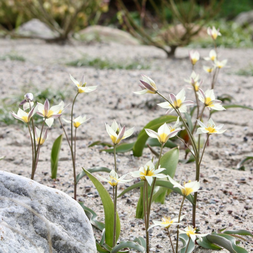Auch die Wahl der Pflanzenfarben spielt in der Wirkung eine große Rolle. Rottöne sind natürlich gewagt, aber der Herbst bringt durch die Färbung verschiedener Laubgehölze oder einer Fetthenne wie die Sorte „Herbstfreude“ warme Töne in den hellen Farbton des Sandes. Helle Gräser sollte man daher immer in der Kombination mit stärkeren Farben einsetzen – sonst verlieren sich diese im hellen Sand. Auch bei der Wahl von Zwiebelblühern – hier bitte auf solche achten, die kargeren Boden mögen (z.B. Wildtulpen) – ist eine Fernwirkung zu beachten. Die auf dem Foto dargestellte schwefelgelbe Tulipa turkestanica ist traumhaft schön, in der Fernwirkung aber nur bei bestimmten Lichteinwirkungen gut sichtbar.