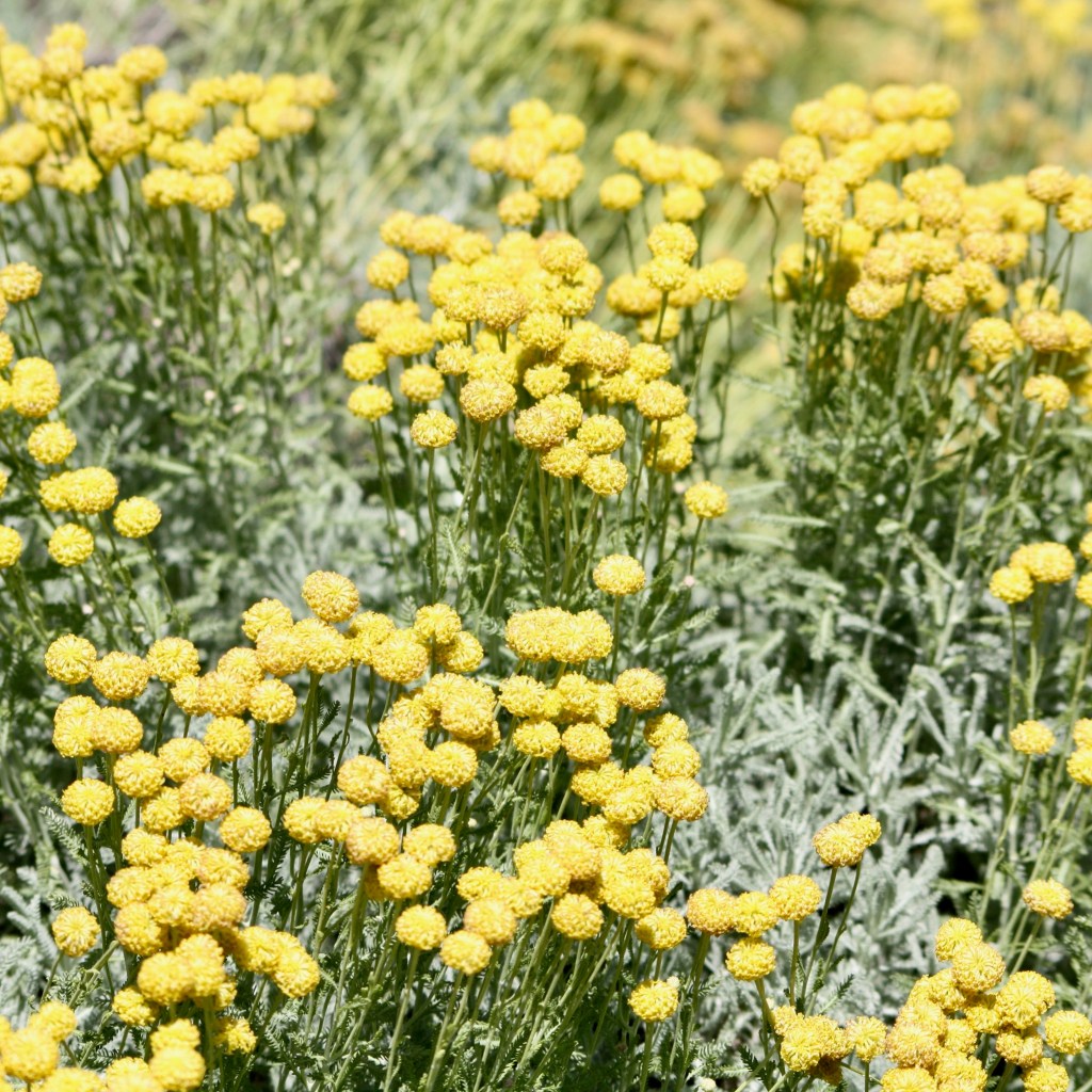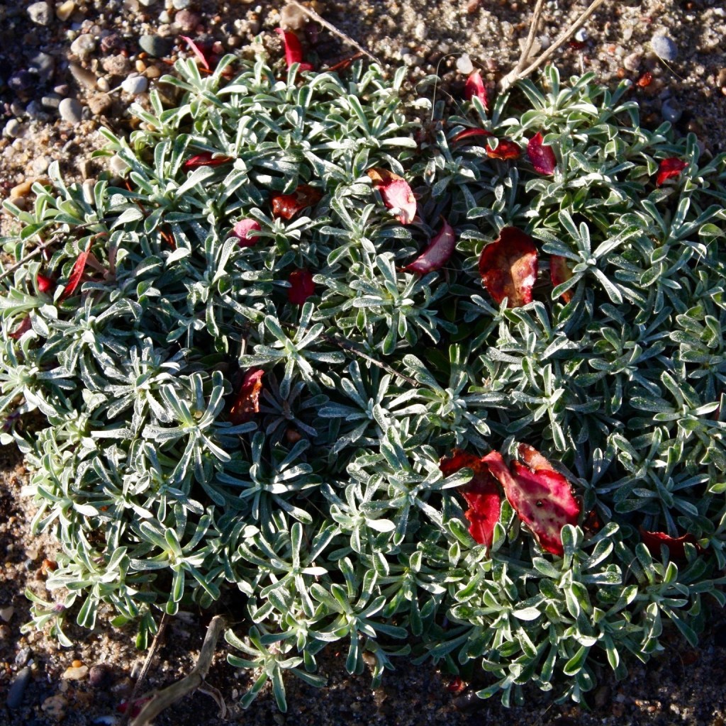 Eher ein Gerüstbildner als ein Bodendecker ist das Heiligenkraut – oder auch Zypressenkraut genannt (Santolina x lindavica). Der flache Halbstrauch ist eine Kreuzung aus Gefiedertem und Grauem Heiligenkraut mit blaugrünen Blättern und gelblichen Blüten. Es liebt die sandigen nährstoffarmen und trockenen Böden in Nordfriesland, weniger die Kleiböden. Mit seinem silbrigen immergrünen Laub schützt es die Böden auch sehr dekorativ im Winter und sieht fantastisch mit Lavendel zusammen aus. Für die schönen ökologischen Friesenwälle in unserer Region eine tolle niedrige pflegeleichte Pflanzkombination.
