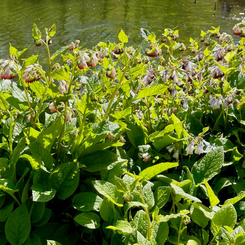 Nun wandern wir mit den Ansprüchen langsam in den (Halb-) Schatten … Der wintergrüne Beinwell (Symphytum grandiflorum) verträgt auch Sonne, fühlt sich aber vor allem auf feuchten, frischen Böden im Schatten höherer Gehölze wohl. Dort breitet er sich auch nach Herzensliebe aus, verzückt uns mit seinen röhrenförmigen hübschen Blüten, durch die sich Hummeln durch“nagen“ und den wertvollen Nektar genießen. Nach einem Rückschnitt (kein Muss!) treibt die Staude oft noch ein zweites Mal mit Blüten aus. Da dieser Bodendecker sehr konkurrenzstark ist, hält der Beinwell auch die Nachbarschaft von Efeu aus. Aber dazu kommen wir gleich …