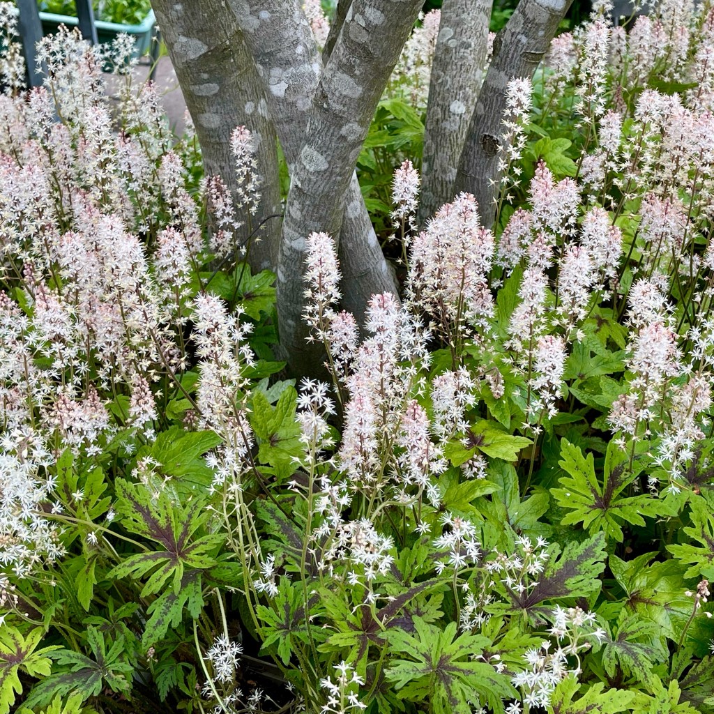 Unter Gehölzen im Halbschatten oder Schatten blüht in dieser Jahreszeit einer meiner Lieblings-Bodendecker, die Herzblättrige Schaumblüte (Tiarella cordifolia). Sie benötigt zwar etwas humosreicheren Boden, aber wenn sie einmal eingewachsen ist, bewährt sie sich als robuste und widerstandsfähige Unterpflanzung.