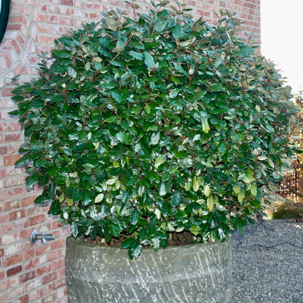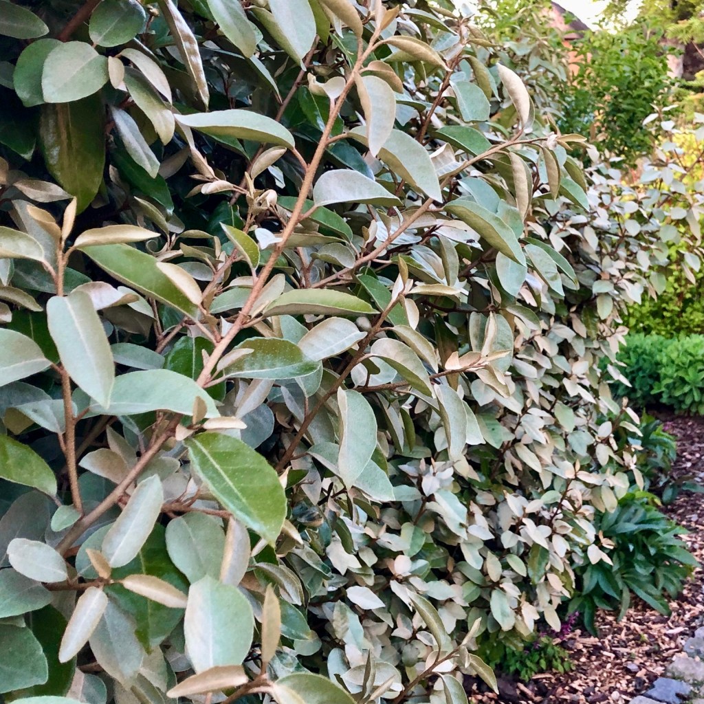 Mein Favorit in unserer windstarken und durch den Klimawandel zunehmend wärmeren Region ist die starkwüchsige und trockenheitsliebende immergrüne Ölweide (Eleagnus ebbingei). Ihr silbergraues Blatt erinnert an Olivenbäume. Orkanstärken können sowohl ihrem Wuchs als auch den Blättern nichts anhaben. Als Flachwurzler solltet ihr in den ersten Jahren allerdings ein Auge auf froststarke Perioden haben. Überflutung UND Frost verträgt sie zu Beginn ggf. nicht so gut. Ist sie erst einmal eingewachsen, bildet sie in wenigen Jahren eine meterhohe Wand. Durch ihre Schnittfestigkeit eignet sie sich auch als Bepflanzung für Trockenmauern oder in breiten Kübeln. Im Herbst fängt sie mit einem unglaublichen Duft an zu blühen, und die roten Früchte bieten den Vögeln im Frühjahr vitaminreiche Nahrung (übrigens auch uns Menschen, je nachdem wer schneller ist…).