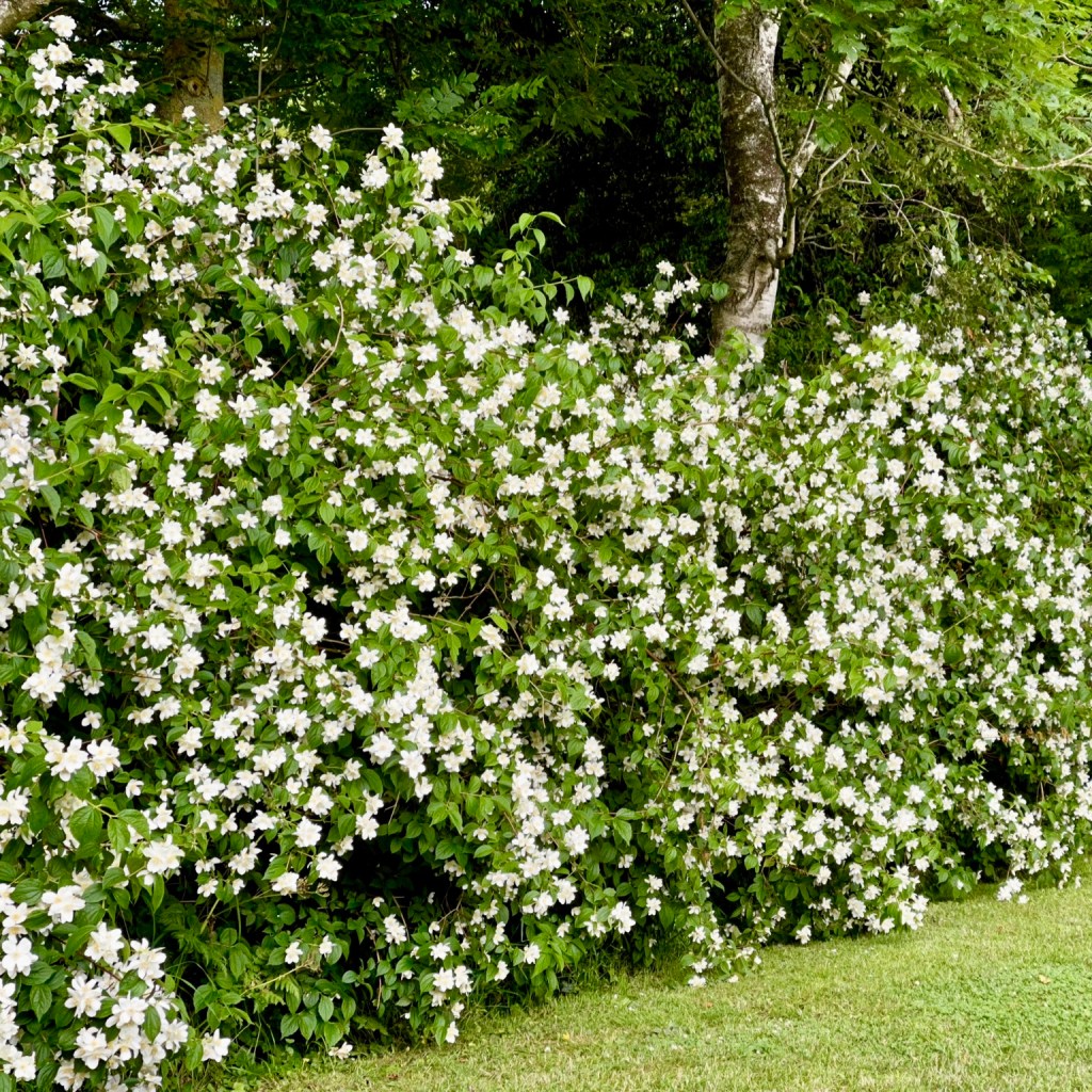 Hingegen ist die heimische Blühhecke des Bauernjasmin (Philadelphus coronarius) laubabwerfend, sehr wüchsig, robust und zudem insektenfreundlich. Ihr Blütenmeer erfüllt die Luft im Mai/Juni mit einem unglaublichen Duft. Wenn Ihr Platz im Garten habt, dann sieht sie sowohl als Einzelstrauch als auch als Hecke wunderschön aus.