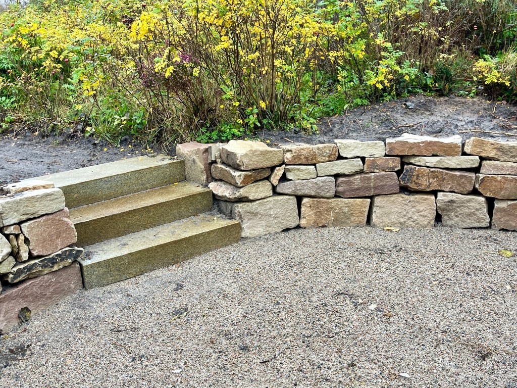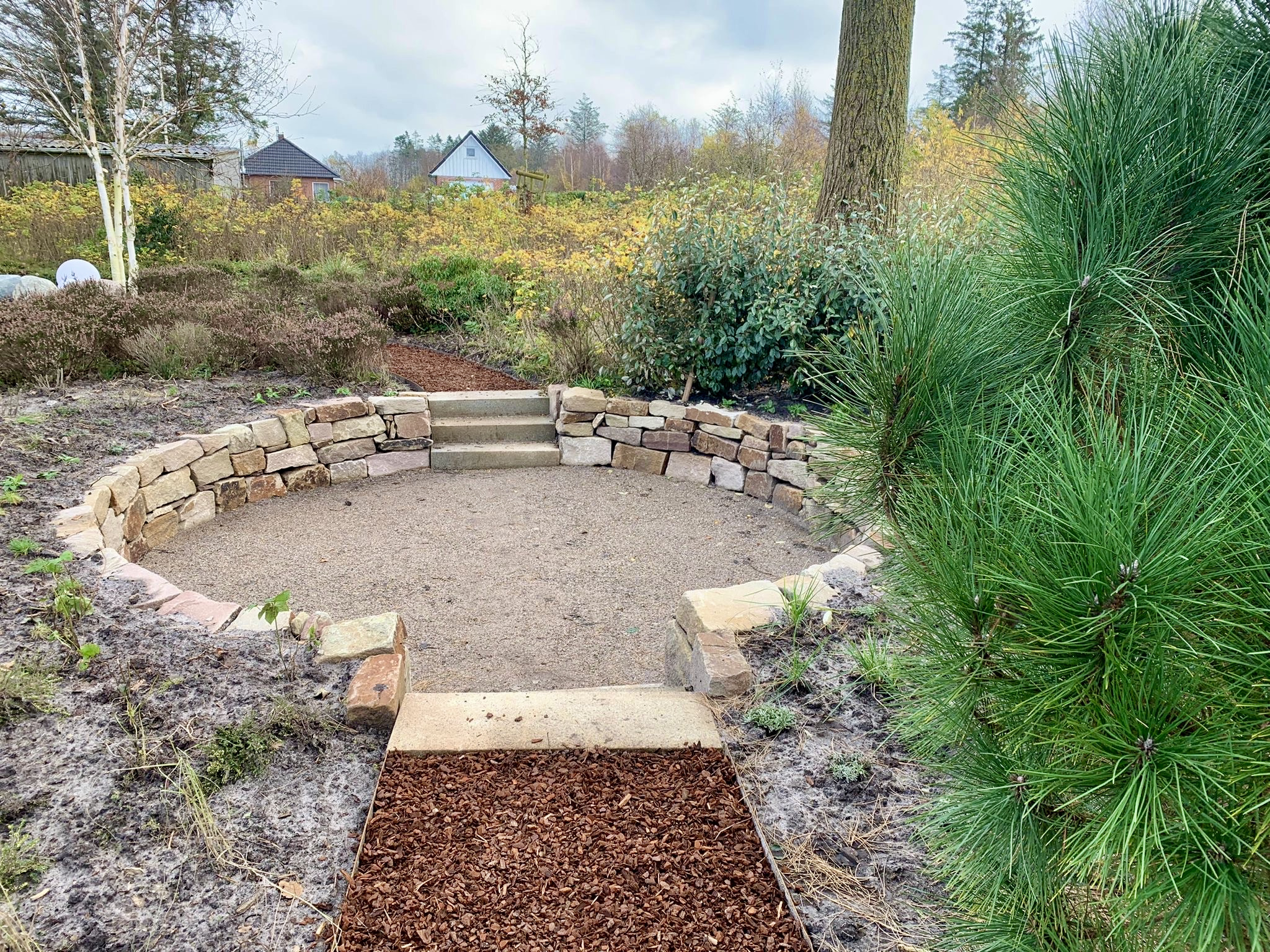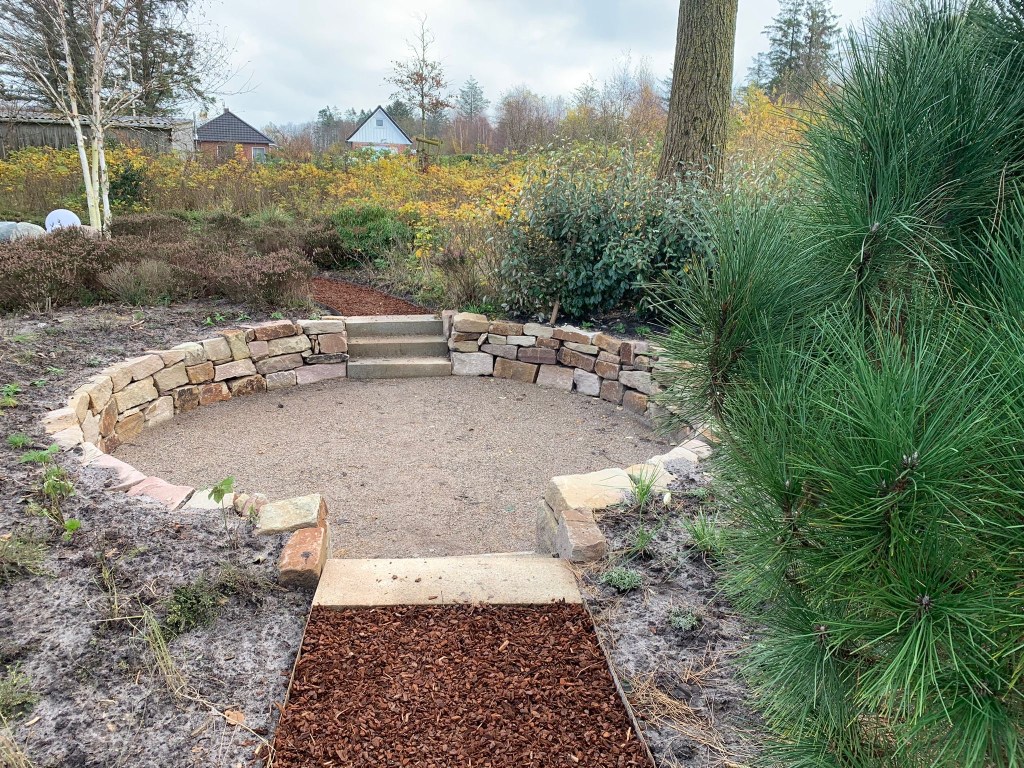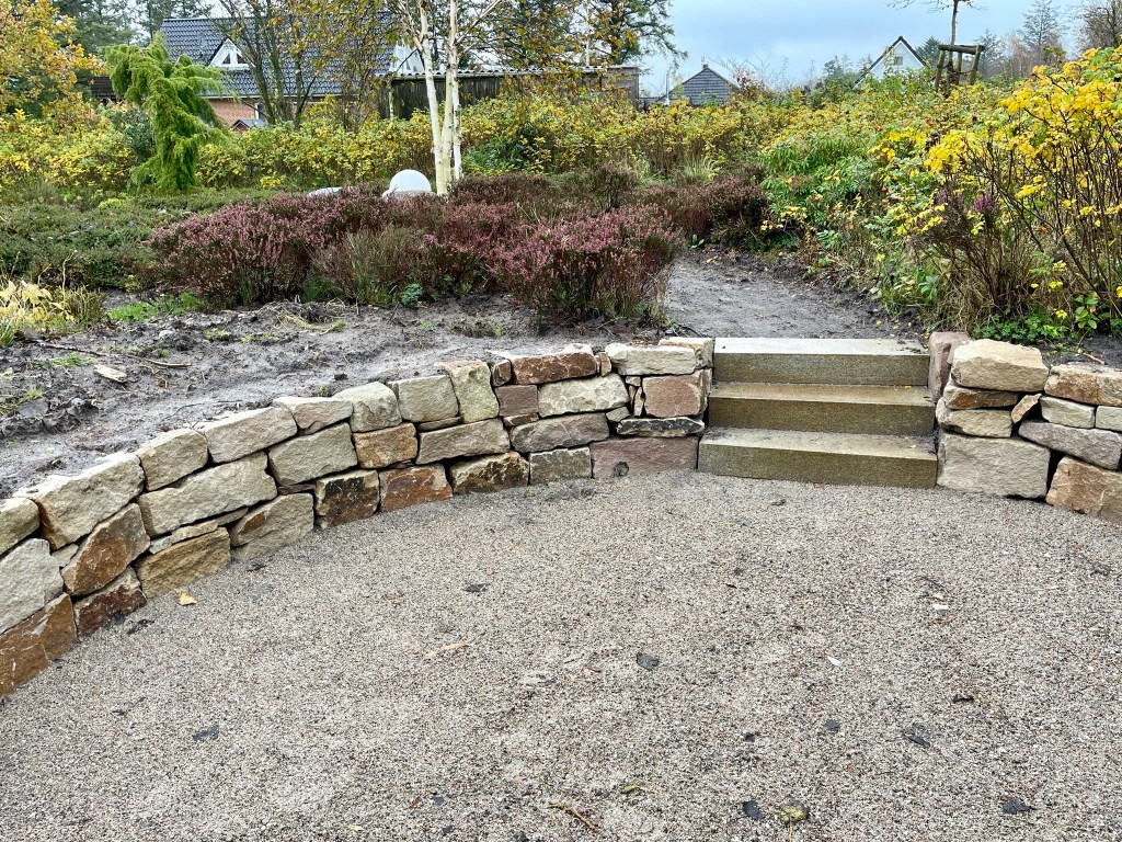 In einer hinteren Ecke des Heidegartens führen diese Wege nun zu einer neu angelegten Senkterrasse, von der aus nun ein ganz neuer Blick in den Garten möglich ist. Mit ausreichend Abstand zum Wurzelwerk der großen Gehölze wurde der Boden abgetragen, um die Vertiefung der neuen Terrasse vorzubereiten. Die Mauer wurde aus Weser-Sandsteinen, die Stufen aus Granit gebaut. Der Boden ist eine naturnahe wassergebunden Wegedecke. Umrahmt wird die Terrasse von immergrünen Ölweiden (Eleagnus ebbingei), die zusätzlichen Schutz vor Wind und Sicht geben werden.
