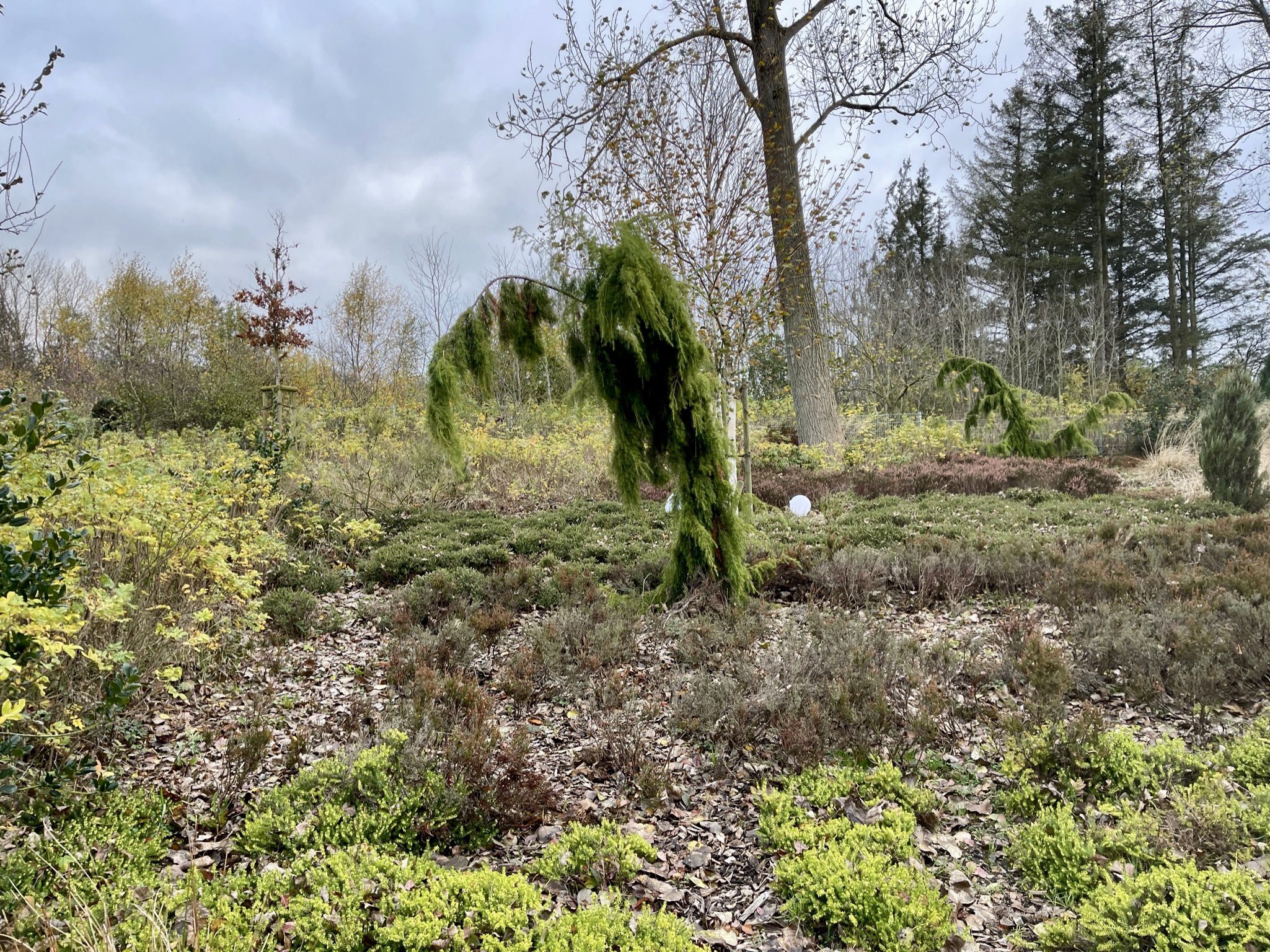 Der Heide-Bereich nach den ersten Umgestaltungsschritten: Ein mit Rindenmulch belegter schmaler geschwungener Fussweg wurde durch die ohnehin spärlich bewachsenen Problem-Bereiche hindurch geführt. Hier können die Besitzer zukünftig mit ihrem Kaffee durch ihren Heidegarten schlendern.