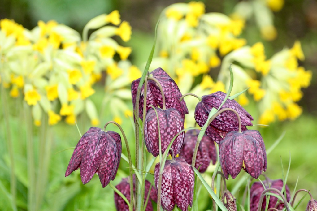 Die zarten Glockenblumen von Fritillaria meleagris, auch als Schachbrettblume bekannt, bilden einen reizvollen Kontrast zu den leuchtend gelben Blüten der Primula veris, oder auch Echte Schlüsselblume genannt. Diese Kombination aus zarten und leuchtenden Farben schafft eine malerische Szene im Garten und ist eine charmante Begrüßung der Frühlingssaison. Beide Pflanzen bevorzugen halbschattige bis schattige Standorte, und – sie vermehren sich auch gern!