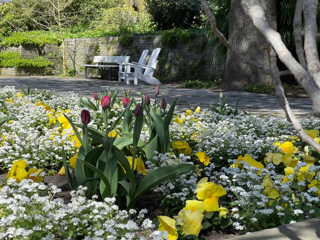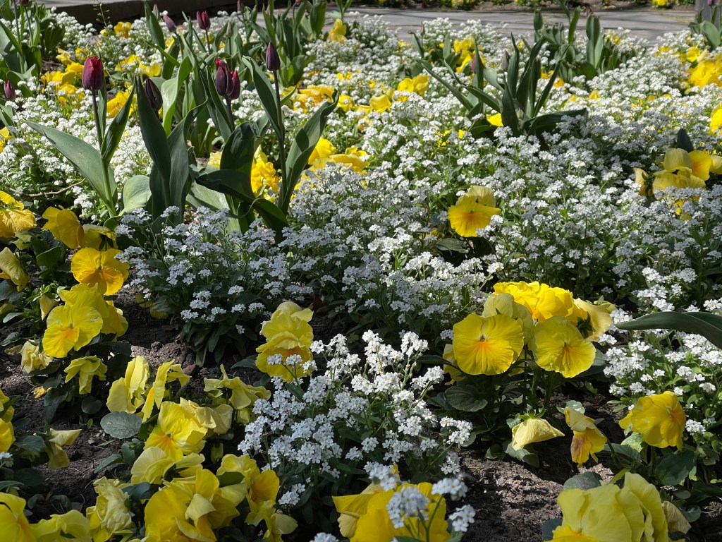 Eine Szenerie, die ich in „Planten un Blomen“ gesehen habe: Tulpen inmitten eines üppigen Teppichs aus Vergissmeinnicht und Stiefmütterchen. Die lebhaften Farben der Tulpenblüten bildeten einen lebendigen Kontrast zu den hier weißen Vergissmeinnicht und den gelben Akzenten der Stiefmütterchen. Auch wenn ich kein großer Fan von Stiefmütterchen bin – diese Kombination ist sehr gelungen und schwer romantisch…