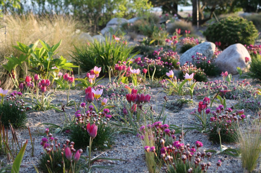 Wildtulpen, Antennaria dioica und Armeria maritima – ein Trio, das sich perfekt für trockene Standorte eignet und besonders in sandreichen, küstennahen Gärten wunderbar gedeiht. Die zarten Blüten der Wildtulpen verleihen dem Beet im Frühling einen Hauch von Eleganz und Farbe, während Antennaria dioica, auch als Katzenpfötchen bekannt, mit ihrem silbrigen Laub und den kleinen, filzigen Blütenpolstern eine texturierte Schicht hinzufügt. Armeria maritima, oder auch Strandnelke genannt, trägt mit ihren kugelförmigen Blütenköpfen zu einem lebhaften und doch zarten Erscheinungsbild bei. Zusammen bilden diese Pflanzen eine harmonische und ökologisch wertvolle Gemeinschaft, die nicht nur den trockensten und windigsten Standorten standhält, sondern auch einen naturnahen Charakter in den Garten bringt.