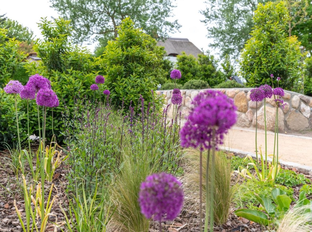 Auch nachdem die Blütezeit vorüber ist, behalten verblühte Allium ihren ästhetischen Reiz und bieten eine faszinierende Struktur im Garten. In Kombination mit Lavendel, Perovskia atriplicifolia und Stipa tenuissima entsteht ein ansprechendes Arrangement, so dass der Garten auch nach dem Höhepunkt der Blütezeit immer noch ansprechend und lebendig wirkt.