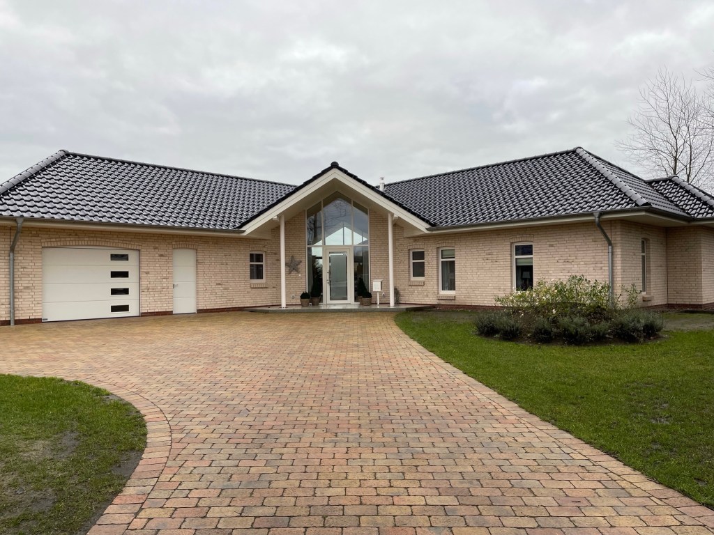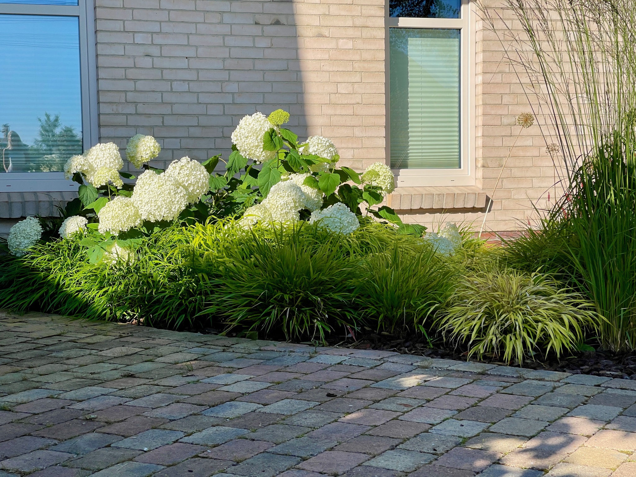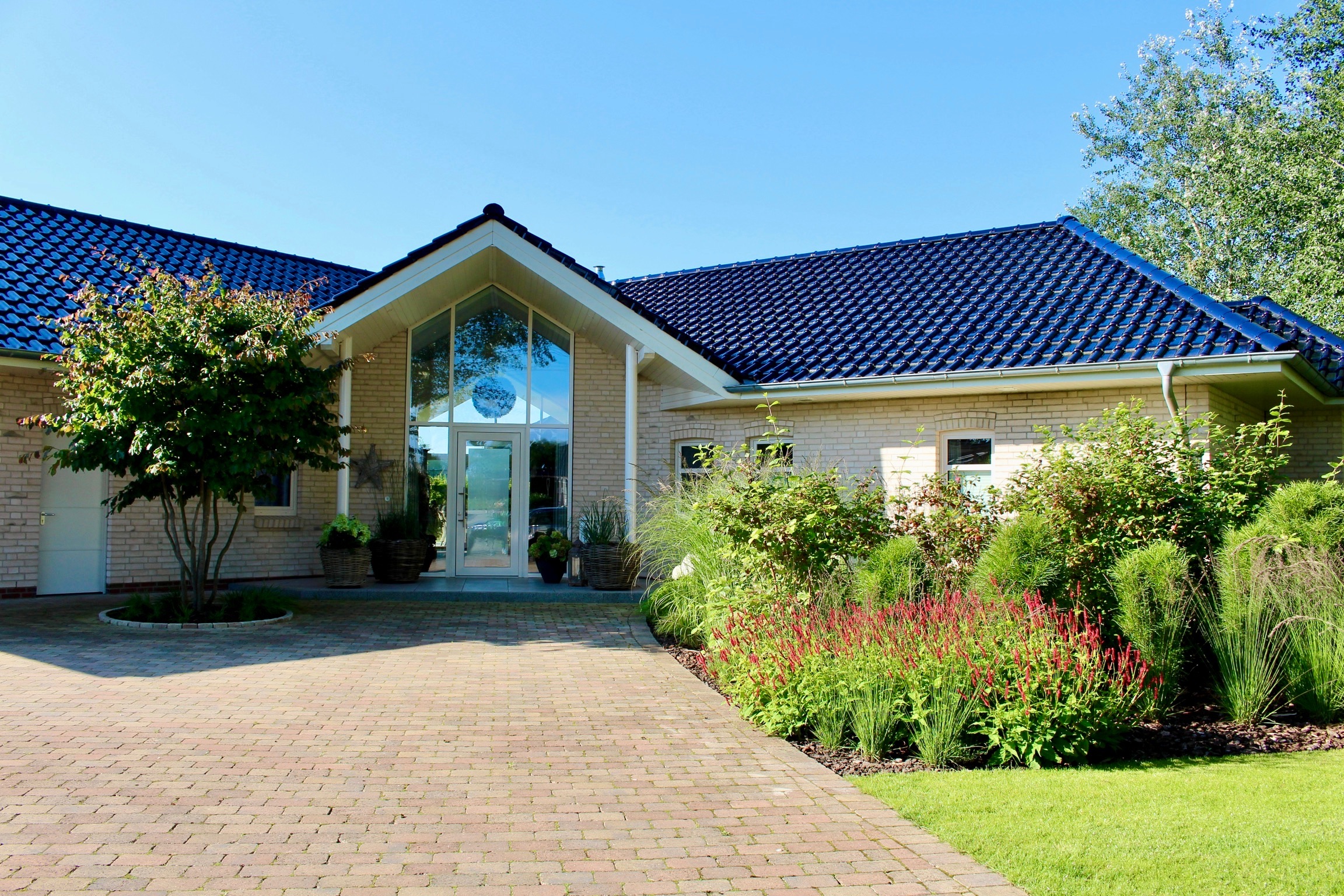 Die Liebe zu Gärten und das handwerkliche Geschick der Auftraggeber haben aus diesem Garten schrittweise ein Refugium entstehen lassen. Teile des noch jungen Gartens waren bereits angelegt. Es gab Verbesserungsbedarf, v.a. aber den Wunsch nach einer repräsentativeren Gestaltung des sehr großen Einfahrtbereiches sowie eine neue Teichanlage. Bei der Größe des Grundstücks (ca. 2.000 qm) und mittigen Lage des Wohnhauses entstanden so verschiedene Gartenräume mit unterschiedlichen Pflanzkombinationen.