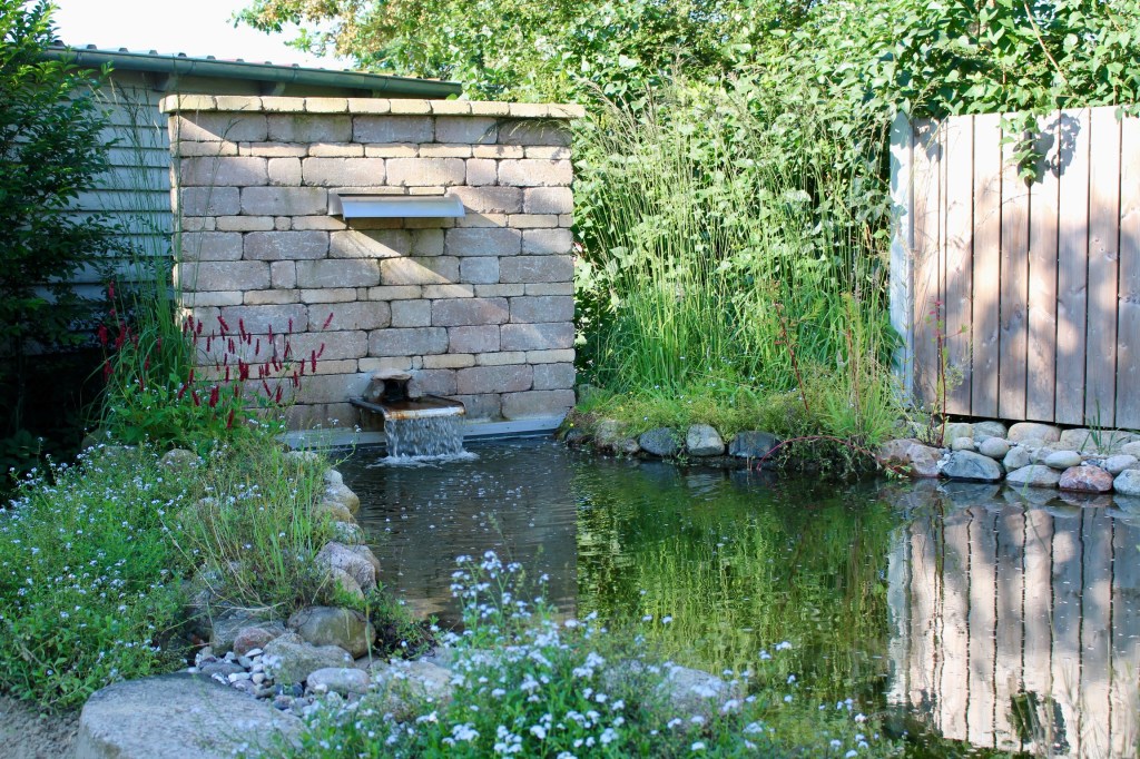 Analog zum Gartenplan und mit dem ästhetischen Gefühl der Auftraggeber entstand jüngst die Teichanlage, ebenfalls in gelungenem Eigenbau.