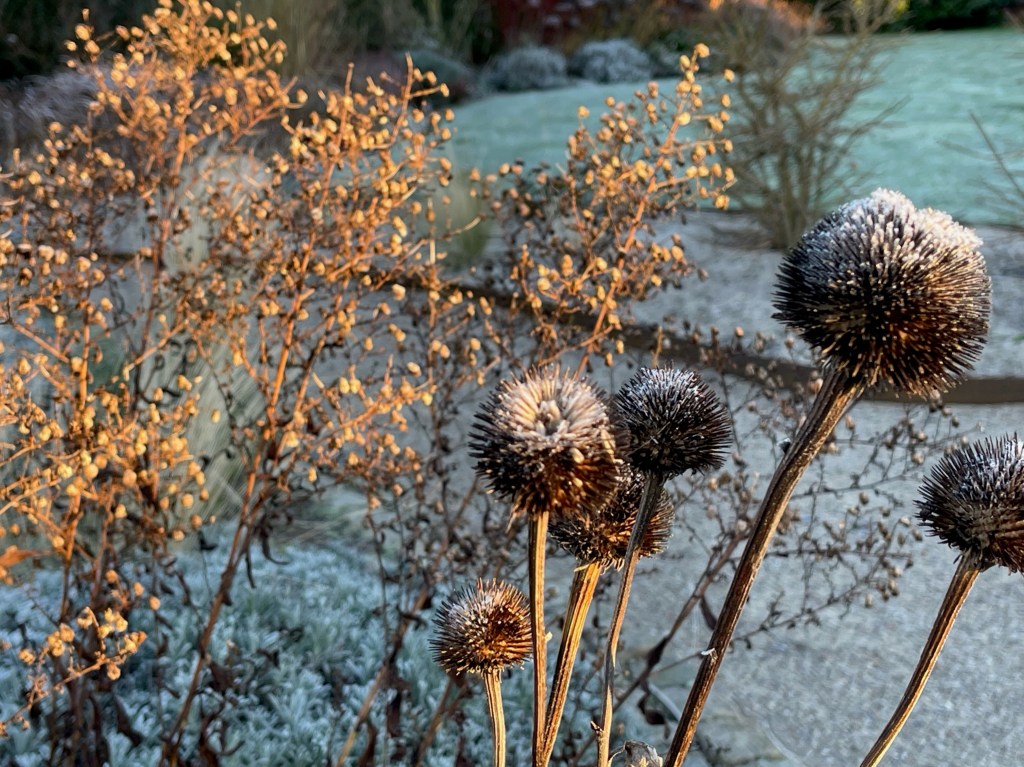 Gerade die Strukturen getrockneter Gräser und Stauden – im Titelbild etwa die Fetthenne – entfalten jetzt ihre ganz eigene Schönheit. Sie geben dem Garten Halt, Tiefe und Ruhe. Und sie sind weit mehr als bloße Dekoration: Samenstände dienen Vögeln als Winternahrung, hohle Stängel bieten Überwinterungsplätze für Insektenlarven und Raupen. Der Garten bleibt ein lebendiger Mikrokosmos – auch im Winter.