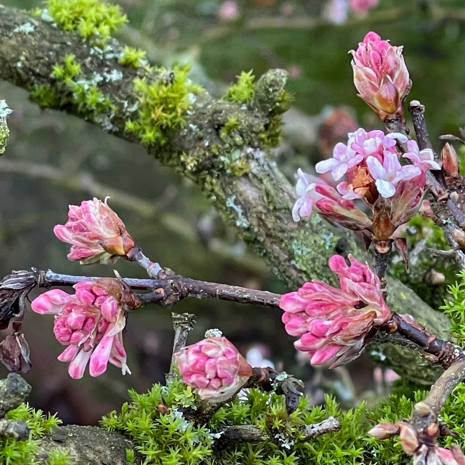 der Winterschneeball Viburnum × bodnantense ‘Dawn’ mit seinen rosafarbenen, intensiv duftenden Blüten, die oft schon mitten im Winter erscheinen.