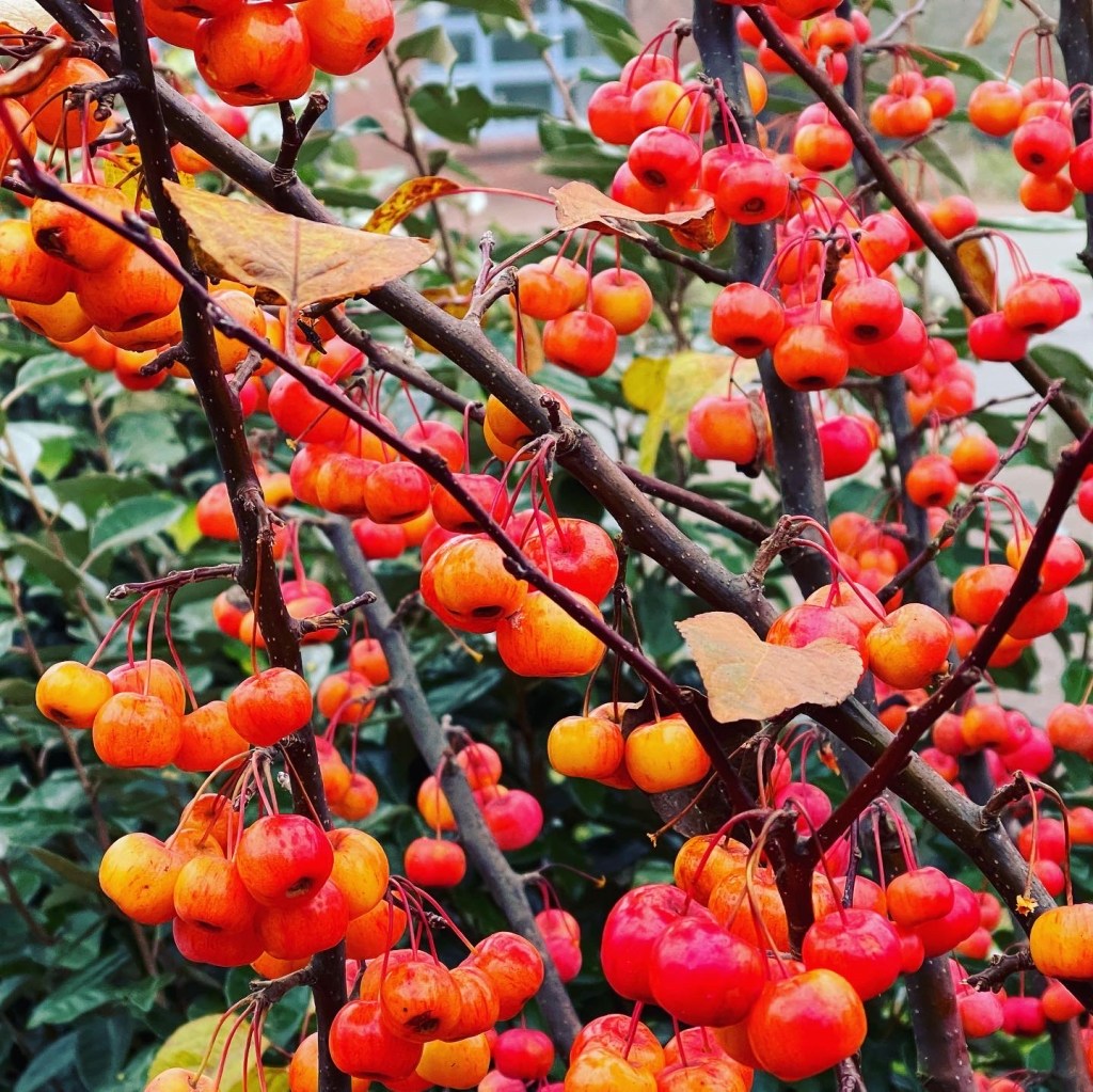 Die Hagebutten der Rosen sind vielen bekannt. Ein weiteres schönes Beispiel sind Zieräpfel, etwa Malus ‘Evereste’, der auch im Winter mit seinem Fruchtschmuck überzeugt. Ich empfehle Sorten, die ihre Früchte lange halten und nicht schon im Herbst verlieren – selbst bei starken Stürmen. ‘Evereste’ oder ‘Red Sentinel’ gehören dazu.