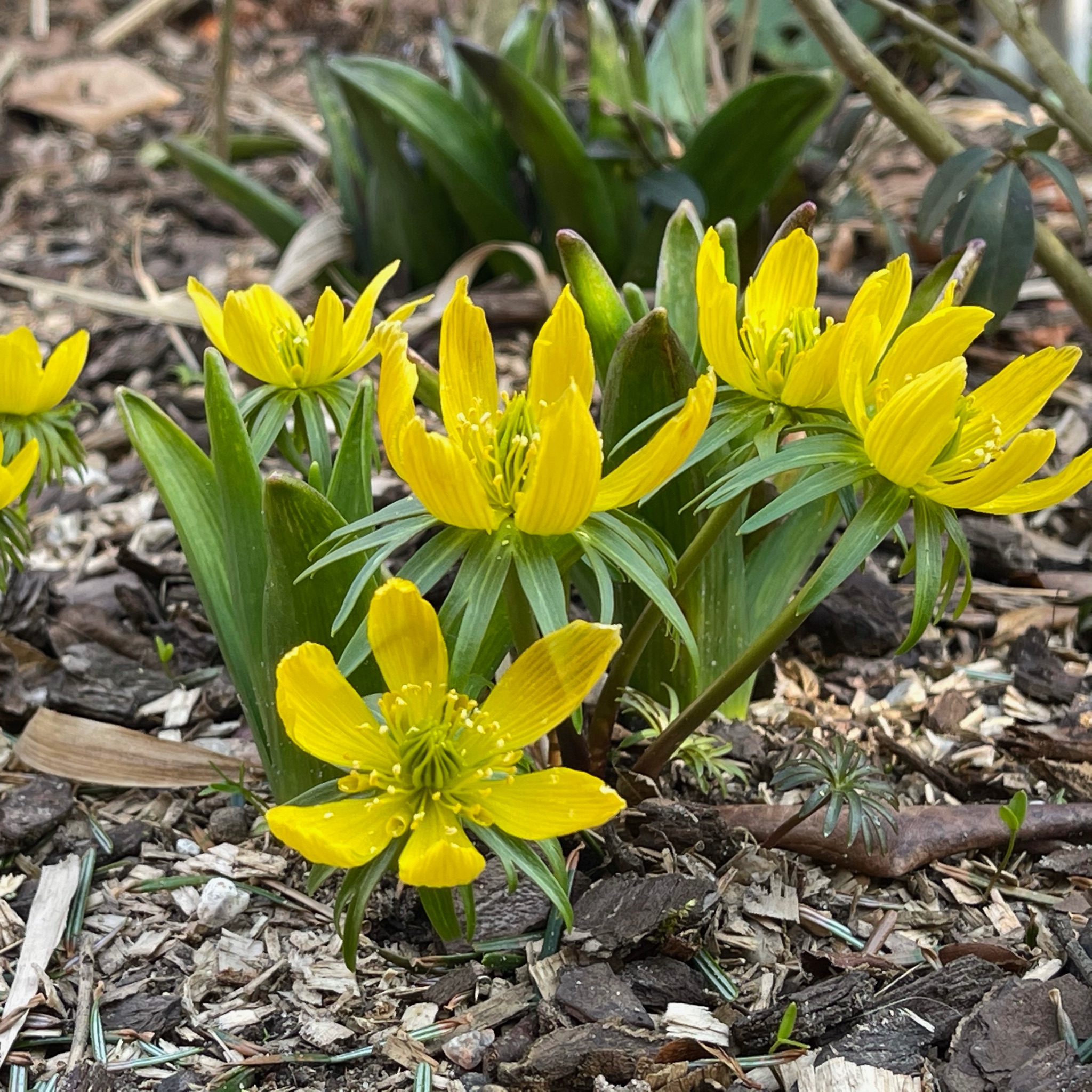 Unterpflanzt mit heimischen Zwiebelblühern wie Winterlingen (Eranthis hyemalis) ist der Tisch reich gedeckt – für Insekten ebenso wie fürs Auge. Im Bild zu sehen ist der Taurus-Winterling mit seinem etwas feineren Grün.