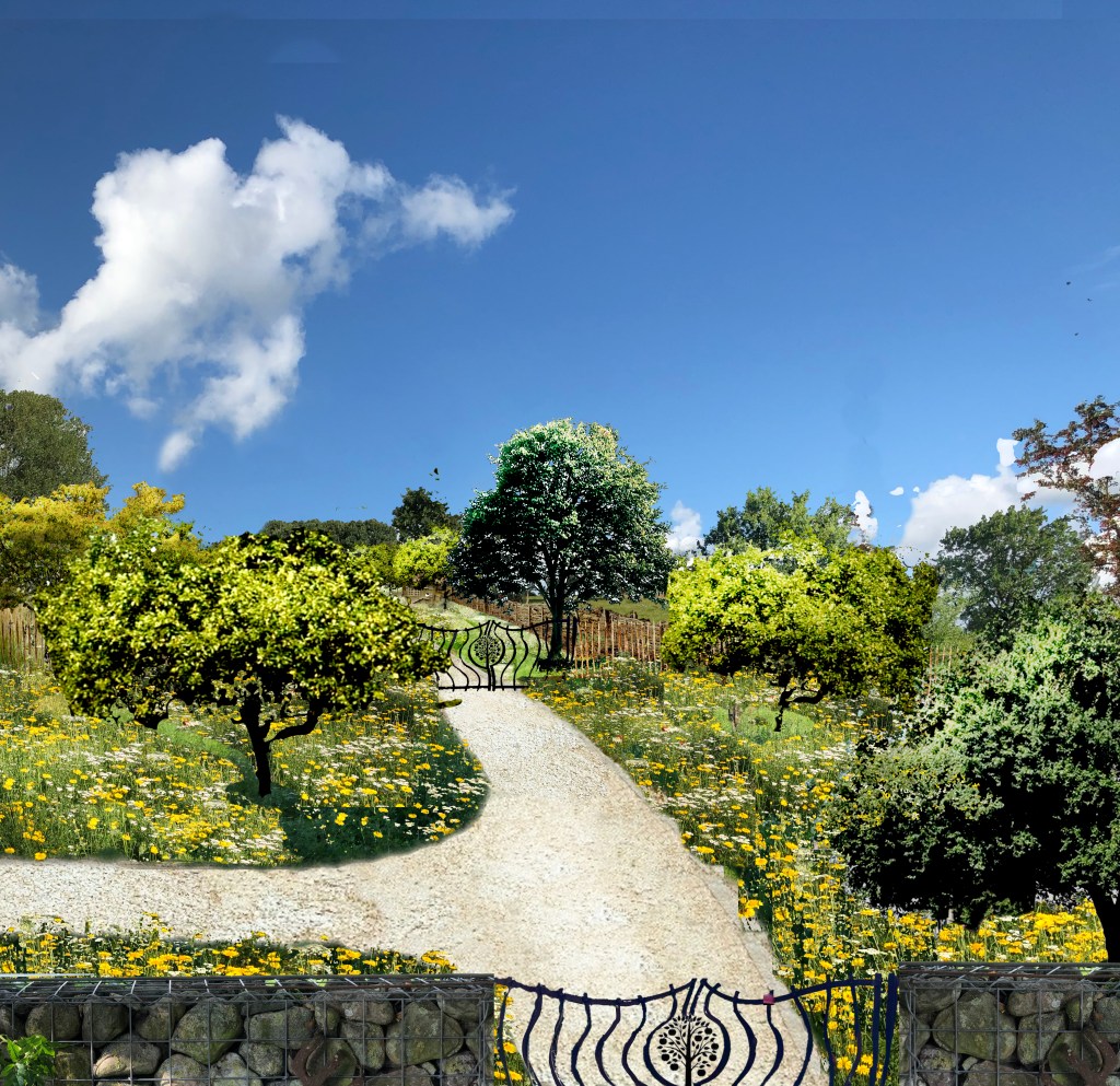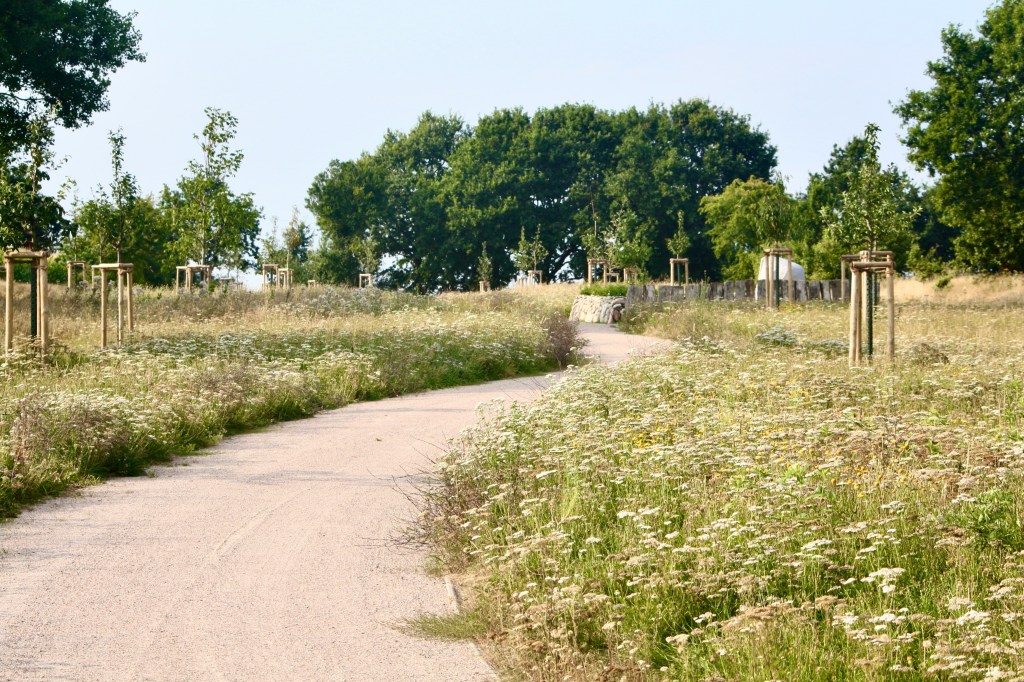 Zwei Sitzplätze, Wildblumen-Biotope, Rosenbeete, ein breiter Wirtschaftsweg und eine besondere Mähweise prägen die Gestaltungsidee in diesem Obstgarten.