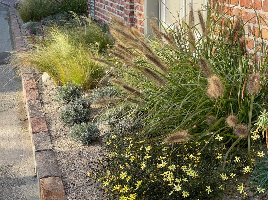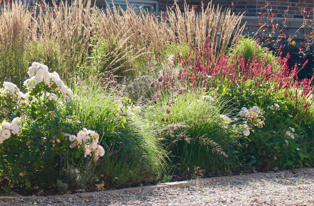 Herausfordernd waren dauernasse Bereiche, insbesondere zur Straße hin. Eine Mischung aus Gehölzen wie Rhamnus frangula ‚Fine Line‘ (Farnblättriges Pulverholz, tolle Herbstfärbung!), Cornus alba ‚Sibirica‘ (Roter Hartriegel, tolle Winterfärbung!), Gräser wie Molinia caerulea (Pfeifengräser) und Stauden wie Persicaria amplexicaulis ‚Speciosa‘ (Kerzenknöterich) halten diese Nässe gut aus. Die herbstliche Farbexplosion wird noch verstärkt durch den Eisenholzbaum (Parrotia persica) vor der Haustür.