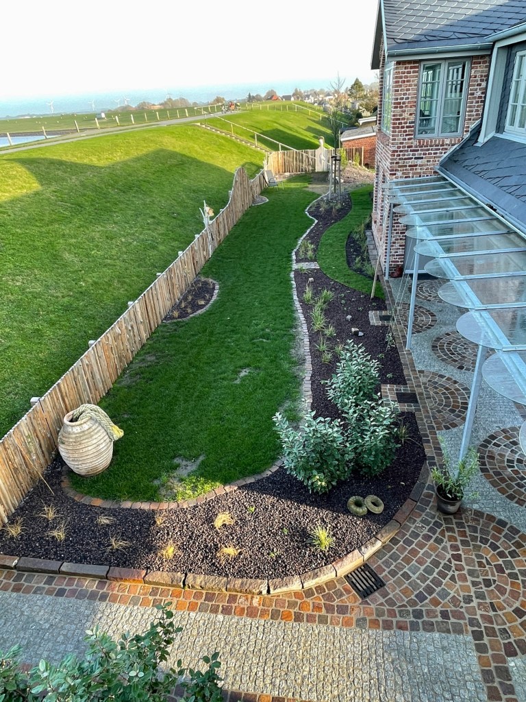 Direkt an der Nordstrander Deichlinie entstand 2022 dieser kleine aber besondere Privatgarten. Die Herausforderung bestand neben der extrem wind-exponierten Lage darin, die Haupt-Bepflanzung nicht an die Deichlinie heranführen zu dürfen und dennoch einen schönen Garten anzulegen.