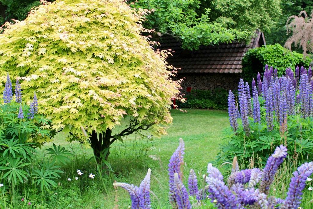 Was passt besser zum Wald als ein Wechsel aus wilden Streuwiesen, gemähten Wegen, Lichtungen und spannenden Gehölzschnitten. Lauschige Sitzecken unter schattigen Bäumen laden zum Verweilen ein. Und natürlich darf auch Farbe nicht fehlen. Kontrastreiche und schlichte Kombinationen mit den Lupinen lassen den Garten modern wirken.