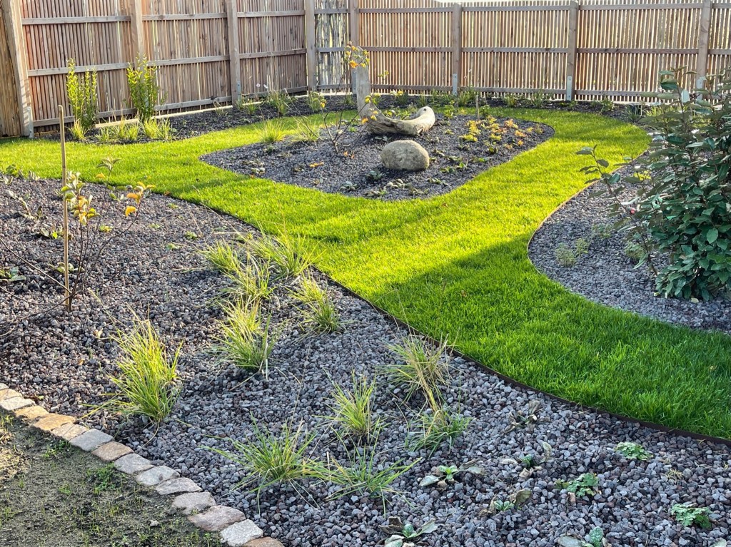 Geschwungene Rasenwege sowie die mit Lavasplitt oder Brechsand gemulchten Beetflächen bringen Klarheit in die zukünftig sicher üppig wachsende Bepflanzung.