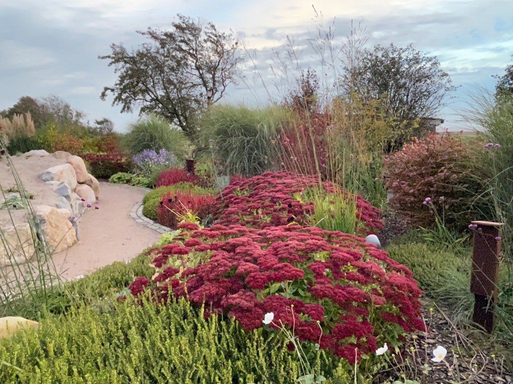 Die Farben des Herbstes sind in diesem Garten besonders beeindruckend. Gräser, rot gefärbte Laubgehölze und Stauden ergeben eine wärmende Atmosphäre, die in den schönen Herbstmonaten an der noch warmen Nordsee nach draußen einladen.