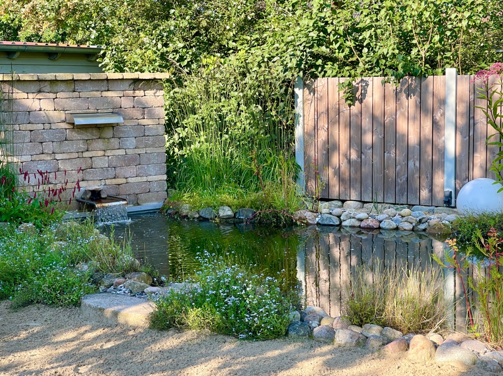 Analog zum Gartenplan und mit dem ästhetischen Gefühl der Auftraggeber entstand jüngst die Teichanlage, ebenfalls in gelungenem Eigenbau. Ein schönes gemeinsames Projekt, das sicher noch nicht zu Ende ist.