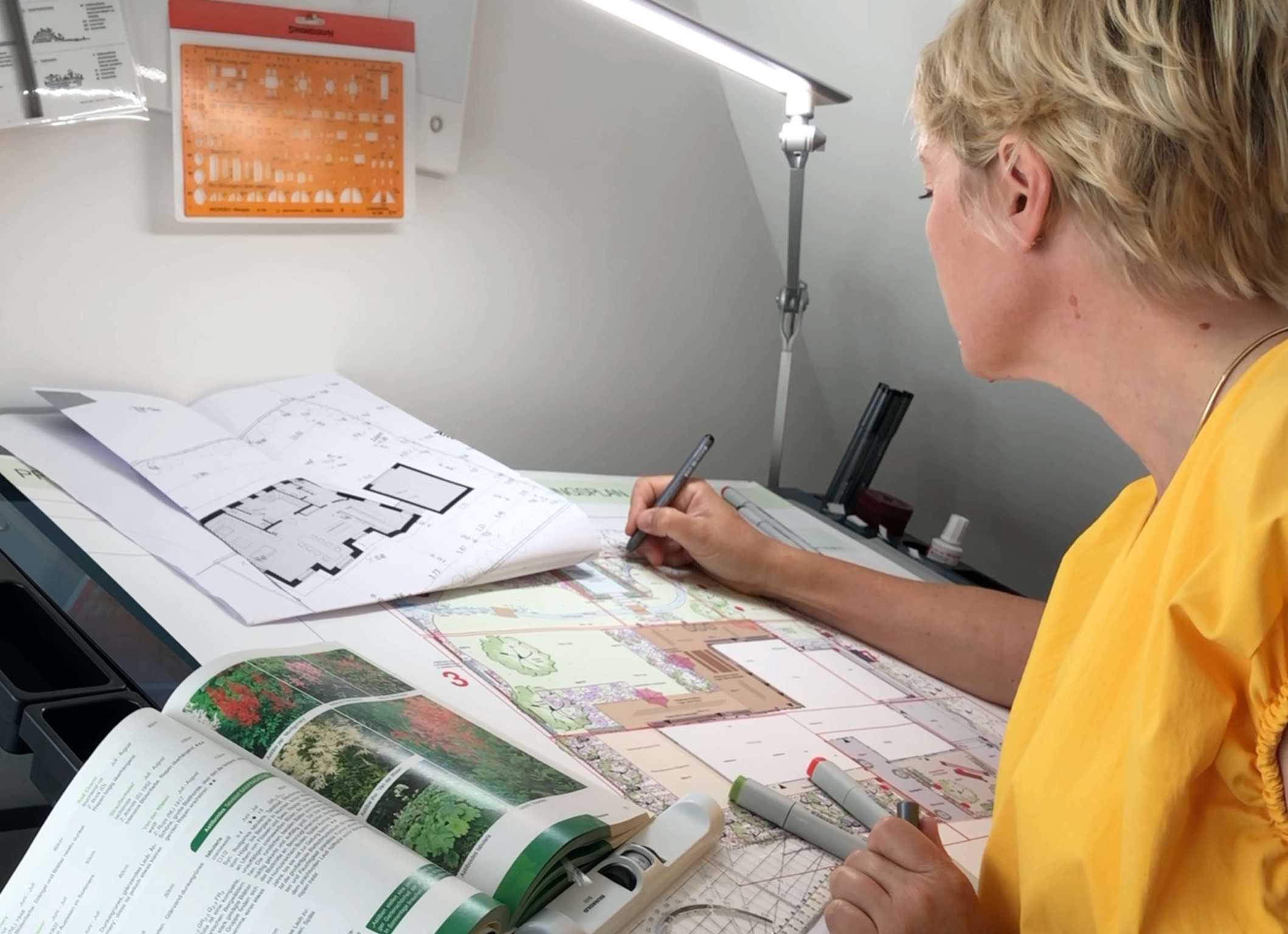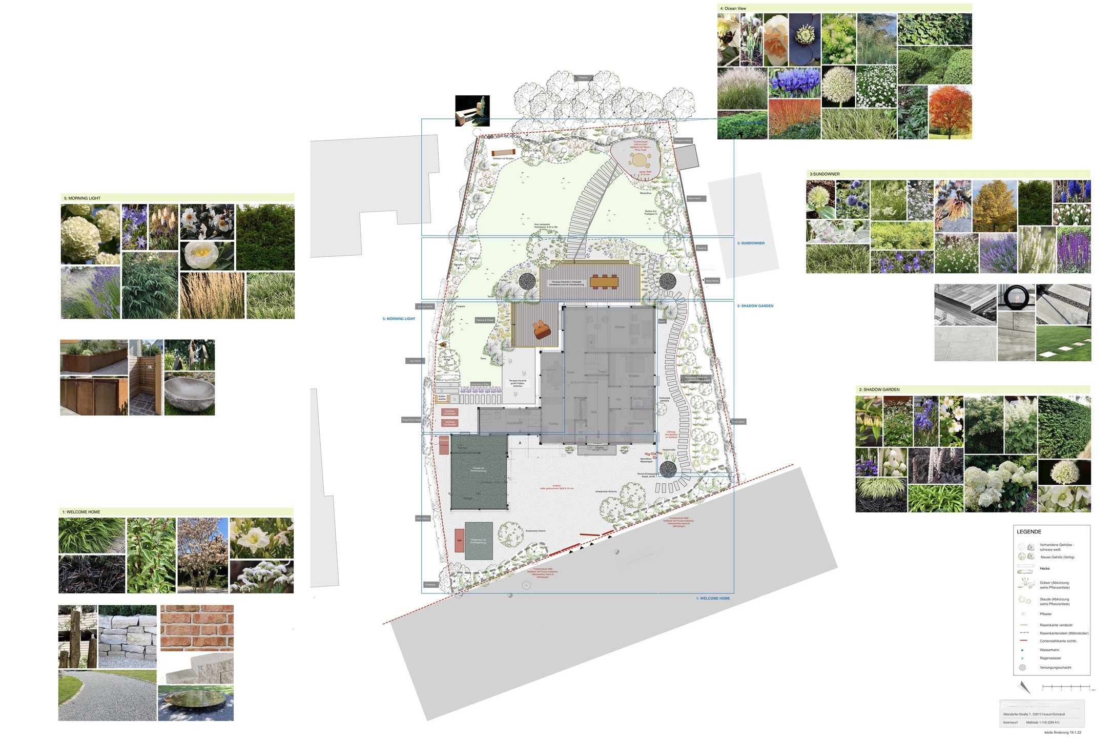 Auf der Grundlage unseres ersten Gesprächs und des von Ihnen ausgefüllten Design Boards erstelle ich für Sie einen Vorentwurf, in dem die gewünschten Nutzungsflächen und konkrete Lösungsansätze für Bepflanzungen und Material enthalten sind. Bei der Pflanzenauswahl spielen neben Ästhetik und Wuchshöhen natürlich der Standort, die Licht- und Bodenverhältnisse sowie die Pflegeintensität eine Rolle.